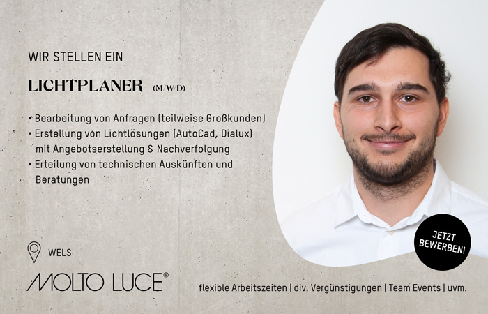 Molto Luce ist Spezialist für innovative Beleuchtungslösungen - und zwar seit vielen Jahren. Als international agierendes Unternehmen entwickeln und produzieren wir designorientierte Leuchten und planen funktionale Konzepte für beste Lichtatmosphäre und -wirkung. Unser Know-how kommt in Projekten von Hotellerie & Gastronomie, Retail, Office & Corporate Architecture, Healthcare oder dem privaten Wohnraum zur Anwendung. 470 Mitarbeitern an zehn Standorten in Österreich, Deutschland, Italien und der Schweiz engagieren sich für die Zufriedenheit unserer Kunden und den Erfolg unseres Unternehmens.