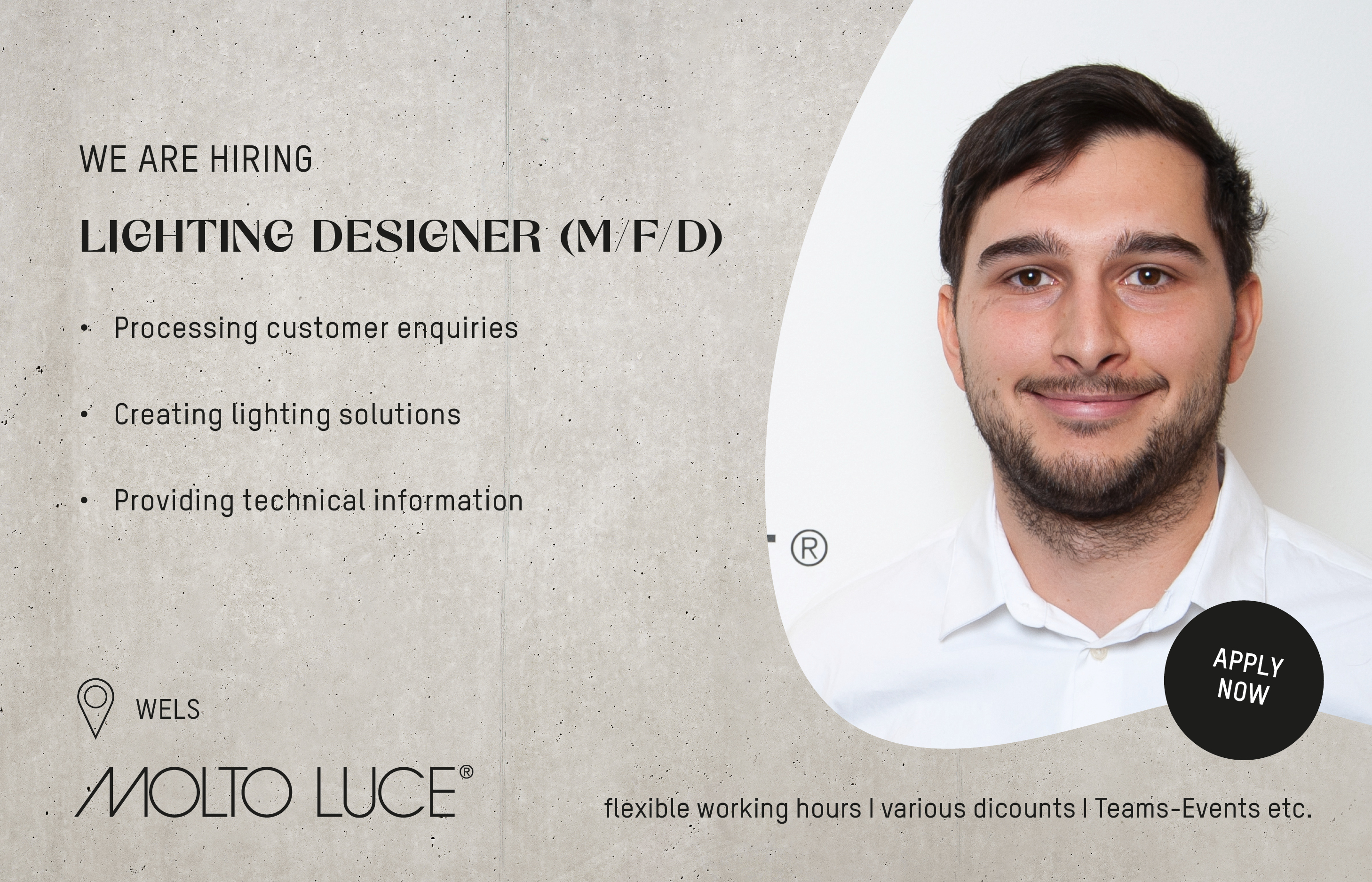 Molto Luce has been a specialist in innovative lighting solutions for many years. As an international company, we develop and produce design-oriented luminaires and plan functional concepts for the best lighting atmosphere and effect. Our expertise is applied in projects in the hotel and catering industry, retail, office and corporate architecture, healthcare and private living spaces. 480 employees at ten locations in Austria, Germany, Italy and Switzerland are committed to the satisfaction of our customers and the success of our company.