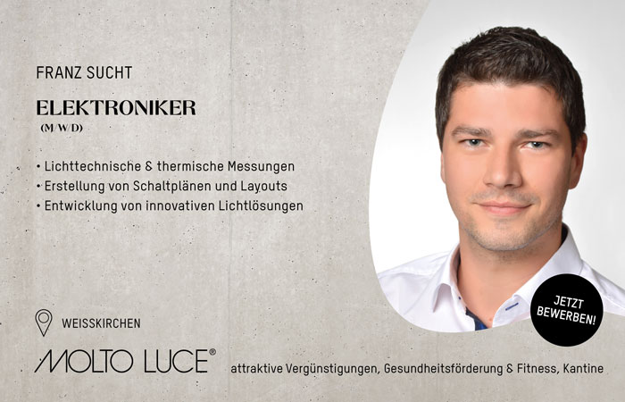 Molto Luce ist Spezialist für innovative Beleuchtungslösungen - und zwar seit vielen Jahren. Als international agierendes Unternehmen entwickeln und produzieren wir designorientierte Leuchten und planen funktionale Konzepte für beste Lichtatmosphäre und -wirkung. Unser Know-how kommt in Projekten von Hotellerie & Gastronomie, Retail, Office & Corporate Architecture, Healthcare oder dem privaten Wohnraum zur Anwendung. 470 Mitarbeitern an zehn Standorten in Österreich, Deutschland, Italien und der Schweiz engagieren sich für die Zufriedenheit unserer Kunden und den Erfolg unseres Unternehmens.